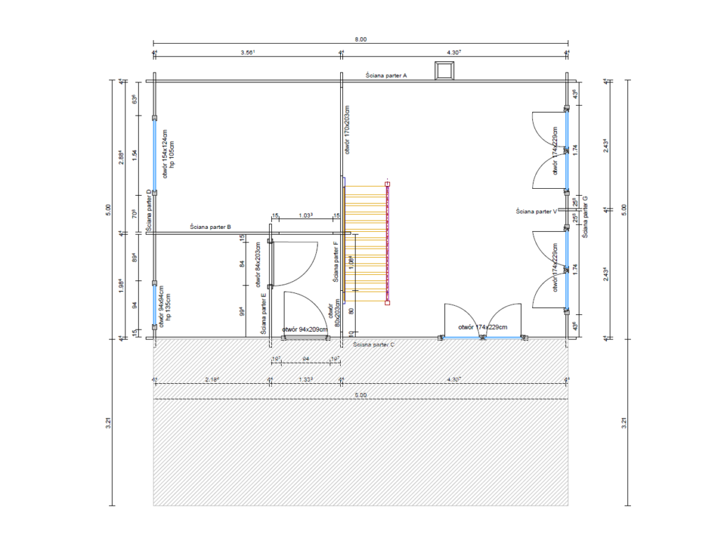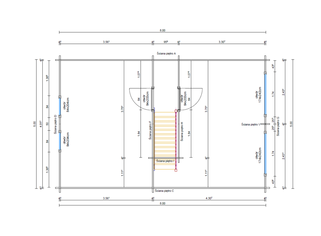 • przedni wypust dachu 50cm poza obrys domu wraz ze ścianami bocznymi
